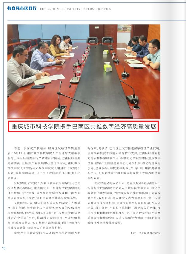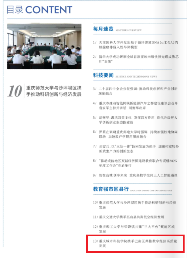 2025年11月3日,《重庆高校科技》2025年第10期(总第25期)正式出刊,重庆城市科技学院人工智能与大数据学院专题稿件“重庆城市科技学院携手巴南区共推数字经济高质量发展”成功入选。此次稿件入选不仅是学院科研服务地方工作的重要成果体现,更标志着学校服务地方数字经济高质量发展的成果获得了重庆市教委的高度认可。