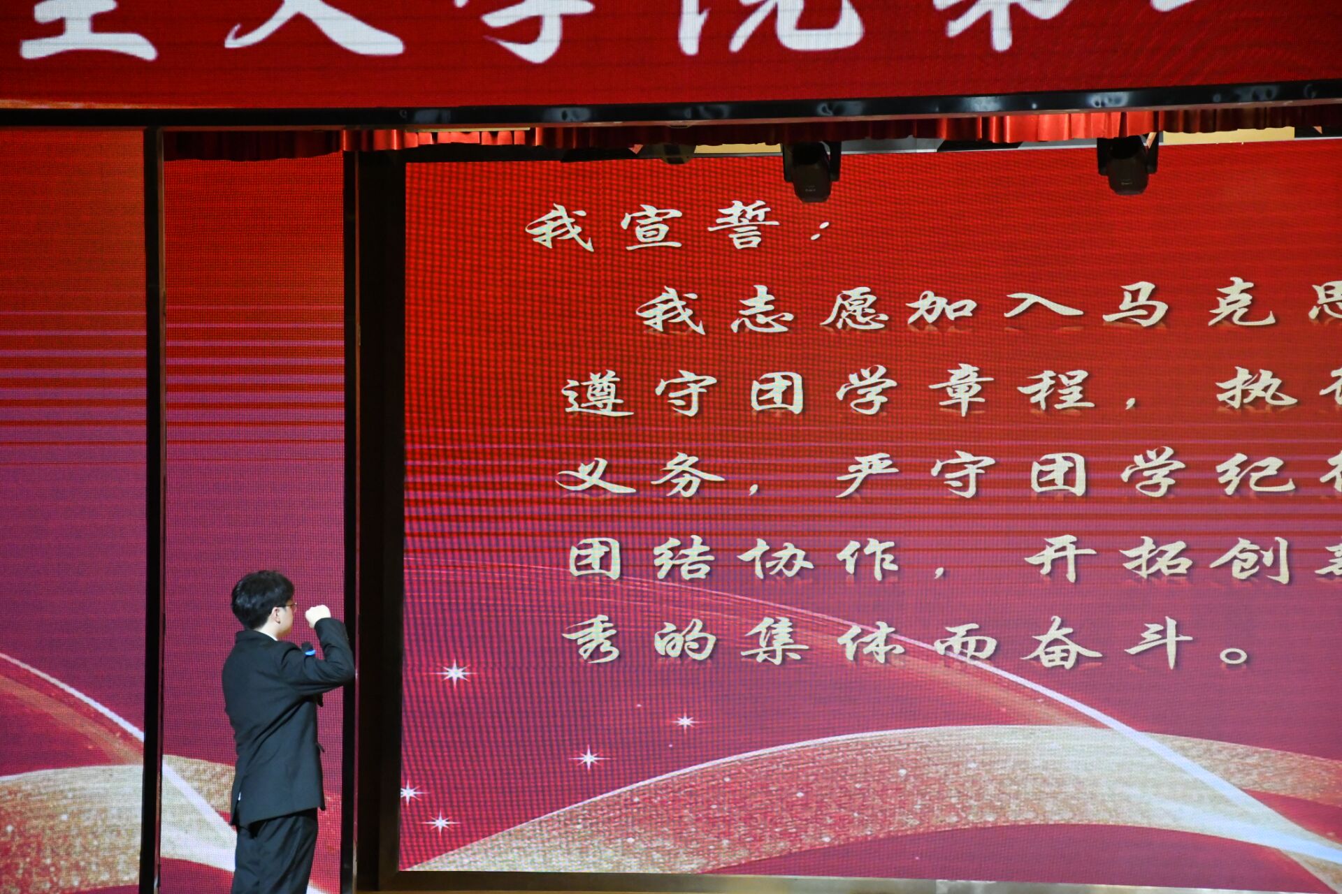 宣誓仪式将现场氛围再次推向高潮。第三届团学全体成员高举右拳,在第三届团总支·学生会副书记陈帆的带领下郑重宣誓,掷地有声的誓言不仅是对团学事业的承诺,更成为刻入灵魂的精神指引。