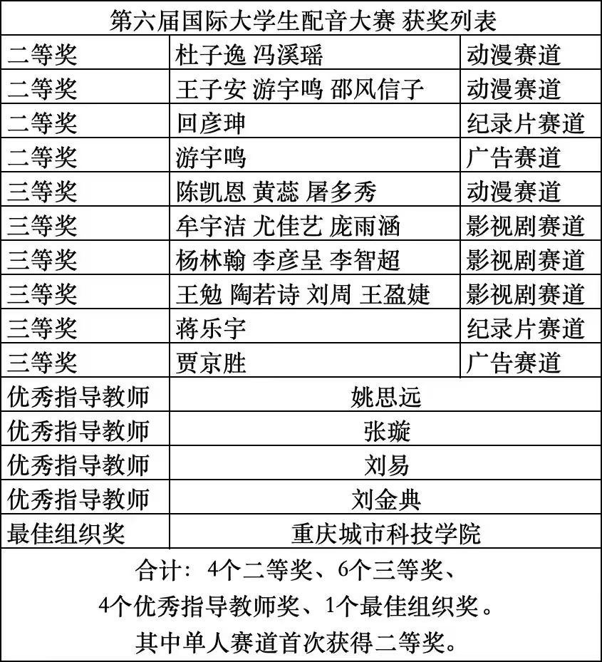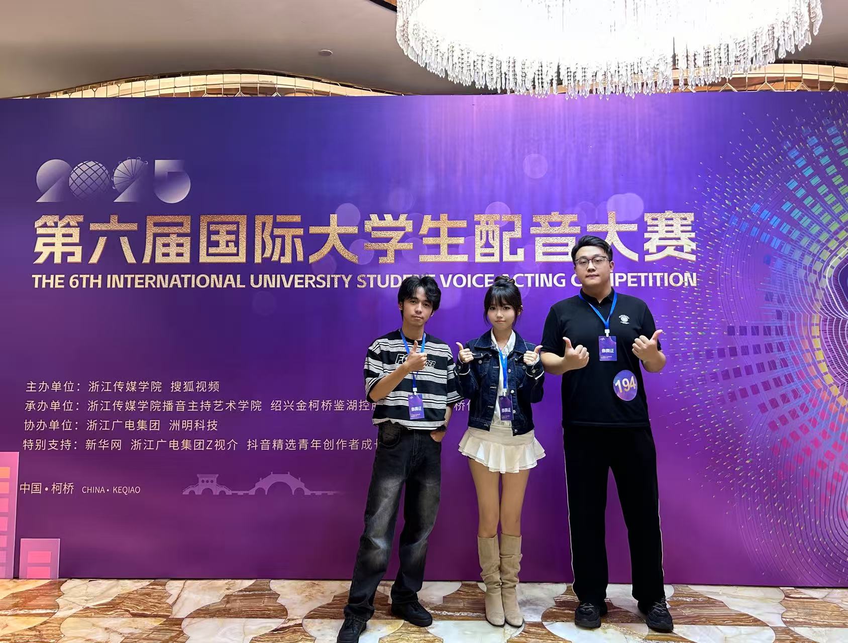 2025年11月1日,第六届国际大学生配音大赛暨鉴湖声音艺术季落下帷幕。重庆城市科技学院艺术与传媒学院播音与主持艺术系师生凭借出色的配音实力与团队协作,在赛事中取得优异成绩。本次大赛,入围线下赛总人数实现历史性突破;斩获4 个二等奖、6 个三等奖、4 个优秀指导教师奖,重庆城市科技学院荣获最佳组织奖。活动由重庆城市科技学院、微影星火数字传媒产业学院组织。 (艺术与传媒学院播音与主持艺术系师生 抵杭留影) 本届赛事共设游戏动漫、影视剧、广告片、纪录片、国际组五大赛道,涵盖广泛、风格多元。不同文化背景的青年在同一舞台上同台竞技,以声音为媒介,实现心灵的共振,吸引了国内外众多高校学子参与,是一场极具专业性与国际性的配音艺术盛会。 在比赛中,重庆城市科技学院学子展现出扎实的配音功底与多元的艺术表现力。10月31日,第六届国际大学生配音大赛各赛道晋级赛,在绍兴柯桥火热开赛。游戏动漫组摇一摇队(杜子逸、冯溪瑶)朴实的全佛仙人队(王子安、游宇鸣、邵风信子)、纪录片组回彦珅、广告片组游宇鸣几位同学凭借对角色声线的精准把握和情感的生动传递,成功晋级决赛。在11月1日的决赛中,以上同学表现依旧出色,均荣获大赛二等奖。 (摇一摇队和孙悦斌老师 赛后合影)(朴实的全佛仙人队 赛后合影) (回彦珅 决赛风采) 其余六组团队和个人均获得三等奖: 配一配看看配不配队(陈凯恩、黄蕊、屠多秀)在动漫赛道中表现亮眼,获三等奖; (配一配看看配不配队 赛后合影) 人从众队(牟宇洁、尤佳艺、庞雨涵)啊对对队(杨林翰、李彦呈、李智超)咱们队(王勉、陶若诗、刘周、王盈婕)在影视剧赛道中,对不同影视角色进行了精彩演绎,获三等奖; (摇一摇队与人从众队 赛后合影) (咱们队 赛前合影) 蒋乐宇和贾京胜两位同学,也分别在纪录片赛道和广告赛道中取得三等奖的好成绩。 (贾京胜 赛前留影) 同时,姚思远、张璇、刘易、刘金典四位教师因在赛事指导中表现突出,被评为 “优秀指导教师”;重庆城市科技学院则凭借出色的组织工作与参赛成果,荣获 “最佳组织奖”。 (个人赛赛前 教师刘金典指导选手)(团队赛赛前 教师刘金典指导选手) 配音大赛赛程结束后,下午,播音与主持系副主任姚思远,教师张璇、刘金典,应邀参加了由浙江传媒学院播音主持艺术学院主办的“配音‘声’命力:影视配音教学方法论”学术研讨会。 (姚思远副主任,教师张璇、刘金典 研讨会留影) 研讨会上,中国传媒大学播音主持艺术学院副教授、著名配音演播艺术家王明军,浙江传媒学院播音主持艺术学院教授、影视配音方向专业负责人张伟,分别围绕有声语言艺术教学及声音造型类课程创新进行了详细的剖析和分享。 (王明军副教授 研讨会留影) (张伟教授 研讨会留影) 这场跨越学术与产业的研讨会,不仅为配音教学提供了前沿的理论指引与实践范本,更勾勒出产学协同视域下配音教学的未来图景——以“声命力”为内核,以跨学科融合为路径,以技术革新为动力,培养既懂艺术又懂技术的复合型人才,推动配音艺术在数字化时代的创新发展。 第六届国际大学生配音大赛以声音为桥,连接世界各地青年学子,让不同文化在同一频率上共鸣。此次获奖,不仅是对重庆城市科技学院配音教学成果的有力肯定,也彰显了重庆城市科技学院学子在艺术实践领域的强劲实力和充足潜力。 未来,艺术与传媒学院播音与主持艺术系将继续深耕配音艺术教育,在重庆城市科技学院、微影星火数字传媒产业学院的组织与领导下,为更多学子搭建更多优质平台,助力他们在艺术道路上再创佳绩! (艺术与传媒学院播音与主持艺术系师生 赛后合影) (本届大配节 成绩汇总表) (文字:刘金典、杜子逸、冯溪瑶 照片:赛事组委会、刘金典、张璇 传媒中心 胡紫怡/编辑)