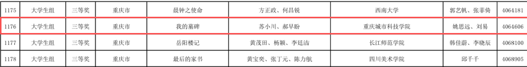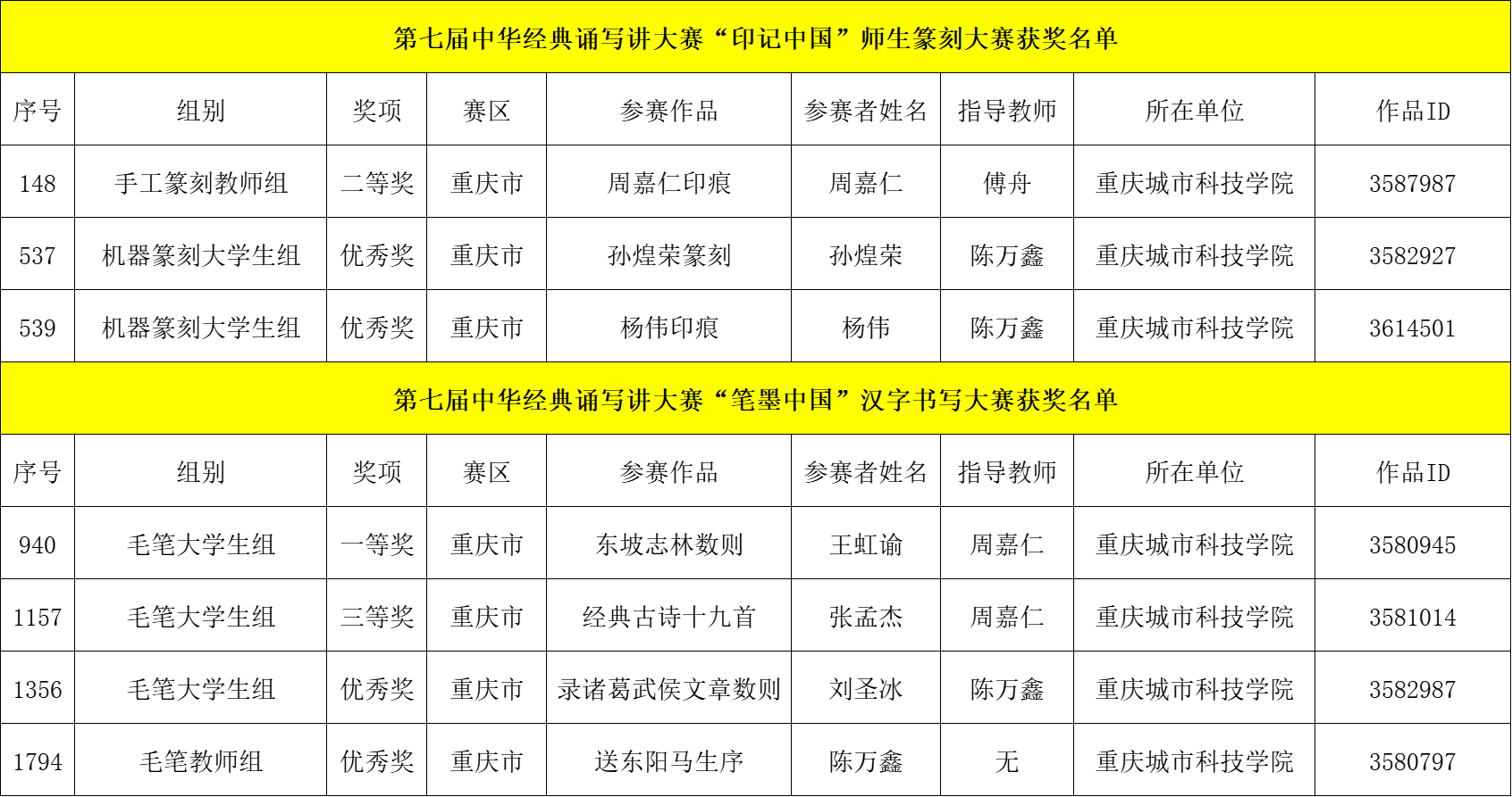 2025年12月2日,全国第七届中华经典诵写讲大赛评选结果揭晓。中华经典诵写讲大赛由国家教育部办公厅部署举办,本届“印记中国”师生篆刻大赛、“笔墨中国”汉字书写大赛、“诵读中国”经典诵读大赛、“诗教中国”诗词讲解大赛历经市赛、全国半决赛、总决赛多轮激烈角逐,重庆城市科技学院师生凭借出色表现,在全国舞台上取得优异成绩,共斩获国家级奖项九项。在“师生篆刻类”和“汉字书写类”取得一等奖1项,二等奖1项,三等奖1项,另有4个作品荣获优秀奖;在“诵读中国类”取得二等奖1项,三等奖1项。本次大赛竞争激烈,学校参赛作品经过严格的校内初选、重庆市选拔,最终被推荐至全国参赛并脱颖而出。 中华经典诵写讲大赛是面向全国校园传承弘扬中华优秀语言文化的重要品牌活动。此次大赛佳绩的取得,是重庆城市科技学院长期深耕专业建设、注重学生综合素质培养的有力印证。更是离不开艺术与传媒学院王颖、姚思远、刘易、周嘉仁以及人文学院曾静等指导教师辛勤付出的成果体现。此次佳绩充分展现了重庆城科师生扎实的语言文字功底与深厚的中华文化底蕴,这一优异成绩,更是学院长期以来坚持“以赛促教、以赛促学”、注重实践教学成果的集中体现。 附优秀作品 (获奖师生/图片 陈万鑫 刘易/文字 传媒中心 胡乐怡/编辑)