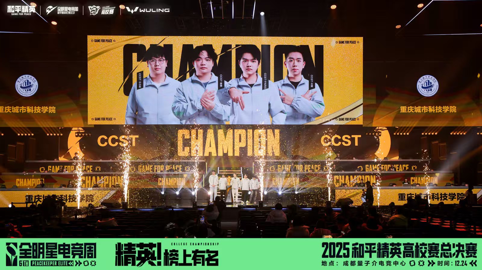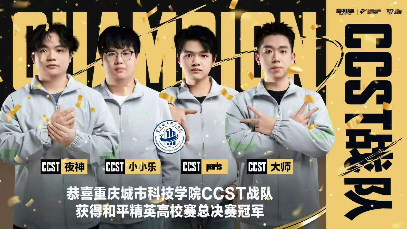 12月24日,和平精英高校赛全国总决赛在成都量子介英雄电竞中心圆满落幕。由重庆城市科技学院艺术与传媒学院团学指导老师韦惯惯带队,重庆城市科技学院CCES电竞社组成的CCST战队历经大区赛等阶段的激烈角逐,在南京工业大学、宁波工程学院、国家开放大学等全国15支高校顶尖战队中脱颖而出,成功问鼎全国总冠军,斩获3万元赛事奖金,创造了学校在该项全国性赛事中的历史最佳成绩。 和平精英高校赛是联结校园文化与职业电竞的桥梁,本届总决赛汇集全国高校精英,采用与PEL职业联赛接轨的竞技规则与赛程,通过多轮次、多地图高强度对抗,全面考验战队综合实力。决赛中,CCST战队开局稳健运营,第二场比赛状态爆发,凭借精妙配合与精准枪法单局斩获19淘汰跃居积分榜首位,核心成员张怡乐(CCST. 小小乐)单局7淘汰跻身全场前列。后续赛事中,战队持续保持高水准发挥,最终以领先第二名47淘汰数的绝对优势锁定胜局。 此次夺冠的CCST战队是典型的跨学科、跨学院融合团队,充分体现了学校学科交叉培养特色。成员包括:艺术与传媒学院2022级网络与新媒体专业杨畯博(CCST. 小 y)、2023级数字媒体艺术专业郑赫(CCST. 亲赤)、2024级视觉传达设计专业谌驰(CCST.paris)、2025级播音与主持艺术专业郑涵文(CCST. 大师),人工智能与大数据学院2024级信息安全专业张怡乐(CCST. 小小乐),建筑管理学院2024级工程造价专业况鹏飞(CCST. 夜神)。不同专业背景的融合,形成了战队独特的风格与战术体系。 荣耀背后是战队的长期积淀。2024年,战队崭露头角,先后夺得川渝大学生电子竞技大赛冠军、和平精英高校赛华西大区第一;2025年实力再升级,斩获和平精英 PEL高校邀请赛冠军、泰山・青未了杯总冠军等多项荣誉,此次全国总决赛夺冠,标志着学校在高校电竞领域实现重大突破。 本次夺冠不仅是竞技层面的胜利,更是学校创新人才培养模式的生动体现。学校历来重视学生全面发展,支持学生在符合学业要求的前提下探索兴趣、施展才华。未来,学校将继续优化 “电竞 + 专业” 融合育人路径,通过完善社团建设、组织专业赛事等方式,为学生提供更广阔的实践平台,助力学生在电竞产业多维度成长,为数字文化产业输送高素质复合型人才。(文字编辑:韦惯惯 图片来源:和平精英官 传媒中心 张学强/编辑)