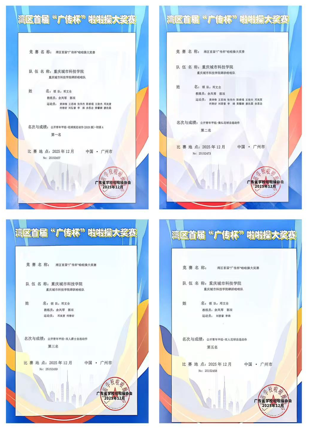 2025年12月5日至7日,湾区首届‘广传杯’啦啦操大奖赛暨2024—2025年广东省学校啦啦操冠军赛在华南农业大学珠江学院广州(从化)校区成功举办。赛事汇聚全国啦啦操精英,以激情与律动点燃冬日校园。 本次大赛由中国蹦床与技巧协会提供技术支持,广东省学校啦啦操协会主办,华南农业大学珠江学院、新活力体育产业学院与广州市从化区文化广电旅游体育局共同承办,并得到北京市健美操体育舞蹈协会、天津市啦啦操运动协会、内蒙古健身舞蹈运动协会等全国十余个省市及港澳地区行业协会的鼎力支持。比赛共吸引来自全国11个省份的155支队伍、超过6700人次参与。各地健儿齐聚珠江学院,以动感节拍诠释团队力量,凭缤纷舞姿展现项目多元创造力,在赛场上共同绽放青春光彩。 重庆城市科技学院肆跃啦啦操代表队在体育与大健康学院陈志军、郭双、余凤琴三位老师的带领下,全力以赴、奋勇拼搏,凭借扎实的技术功底与饱满的精神风貌斩获多项荣誉,尽显青春活力与团队风采。 比赛现场,肆跃啦啦操队队员们默契配合、动作利落规范,将啦啦操的活力与美感完美融合。集体项目中,队员们凭借整齐划一的动作、昂扬向上的姿态脱颖而出,成功斩获集体规定套路冠军与集体自选套路亚军;双人项目赛场同样亮点纷呈,队员稳定发挥,分别获得双人爵士季军、双人花球第五名及双人街舞第六名。个人荣誉方面,秦玲同学凭借出众表现荣获校园啦啦操之星优胜奖,康蕊同学坚守体育精神、展现优良素养,获评体育道德风尚奖。 此次参赛不仅充分展现了重庆城市科技学院学子积极进取、奋勇争先的精神风貌,更以赛事为纽带促进交流学习、实现自我提升,为校园体育文化建设注入了新的活力。未来,肆跃啦啦操队将再接再厉,不骄不躁,在各类赛事中持续突破自我、绽放更耀眼的光彩。 (传媒中心马子微/编辑)