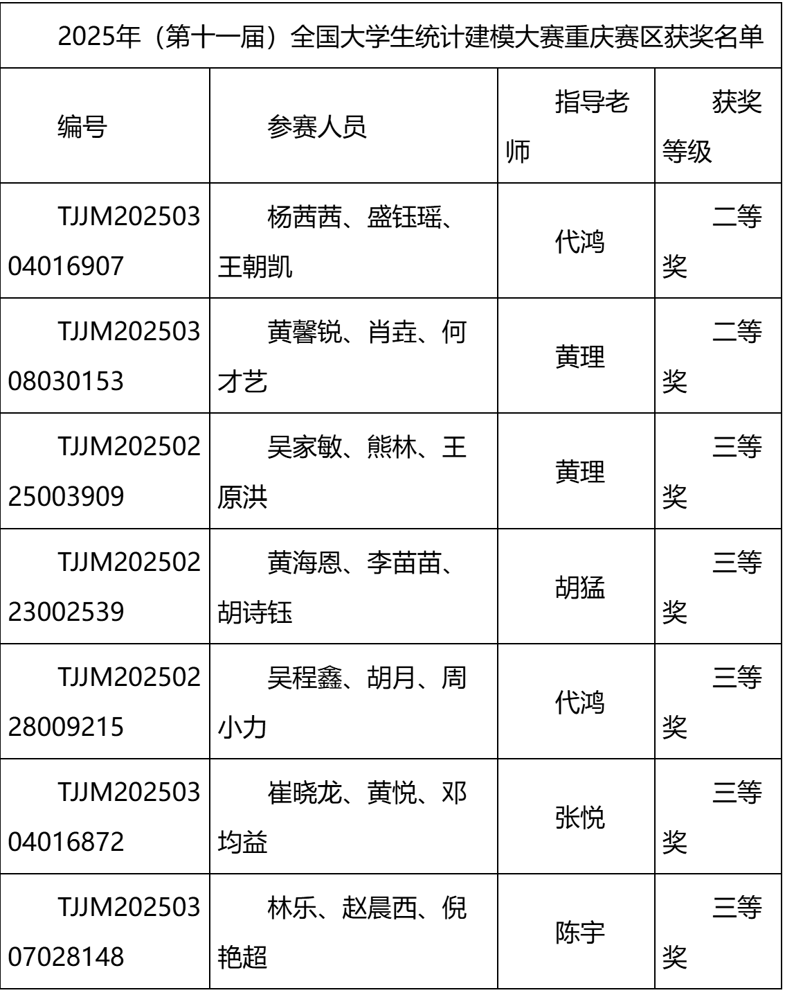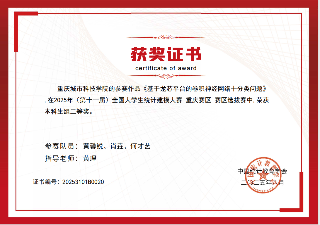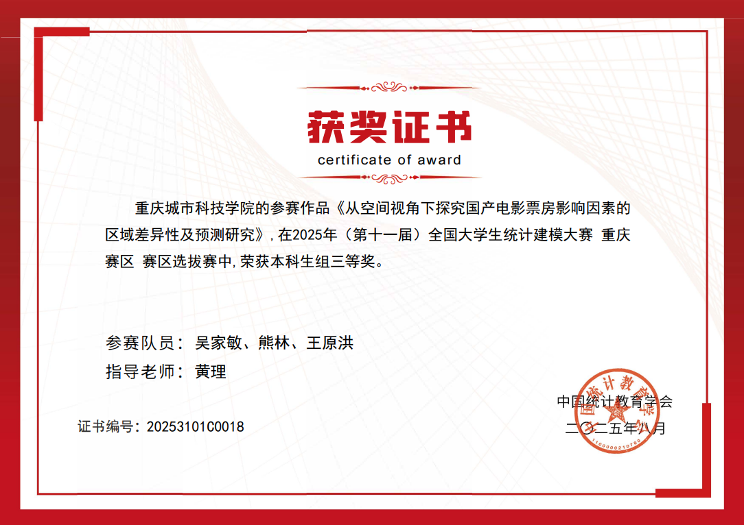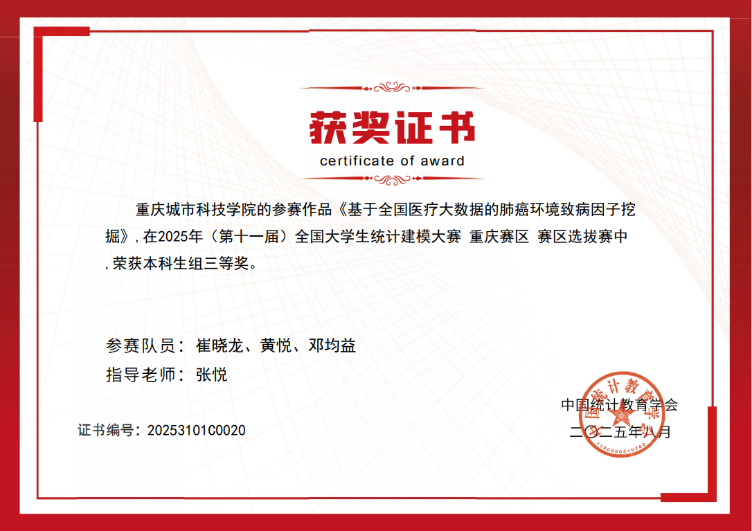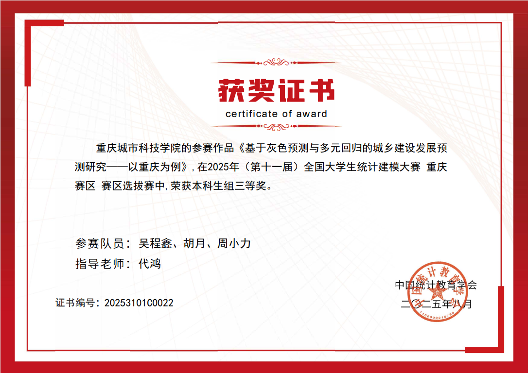 近日,2025年(第十一届)全国大学生统计建模大赛评选结果正式揭晓。重庆城市科技学院选派的参赛队凭借出色的表现,荣获本科组省级二等奖2项、三等奖5项,共计7项,获奖数量创历史新高。具体名单如下: ( 获奖名单) (奖状) 全国大学生统计建模大赛是面向全国高校的重要学科竞赛,旨在激励大学生运用统计方法解决实际问题,提升数据分析和创新应用能力。本届大赛以“统计创新应用,数据引领未来”为主题,吸引了包括多所985高校在内的全国八百余所院校、逾三万支队伍参赛,竞争尤为激烈。该竞赛不仅全面检验学生的综合素养与创新思维,更着重评估其解决复杂实际问题的能力。 本次备赛过程中,由电气工程与智能制造学院牵头并组成的跨学科指导教师团队,共同围绕大赛主题,引导学生从实际应用出发,融合统计方法与数据分析技术,针对现实问题提出具有创新性和实用性的解决方案。团队充分发挥各自学科优势,助力学生在数据建模、算法优化及成果表达等方面实现全面提升。 重庆城市科技学院始终坚持以赛促教、以赛促学的教育理念,积极拓展学科竞赛培育机制,通过跨学院协作、项目化训练等方式,不断增强学生的实践能力和创新意识。今后,重庆城市科技学院将继续完善竞赛组织与服务体系,鼓励更多学生参与高水平学科竞赛,进一步推动统计思维与数据科学在多领域的深入应用,为培养适应未来社会发展需要的高素质人才奠定坚实基础。(杨芯一/文 崔晓龙/图 传媒中心 易雪/编辑)