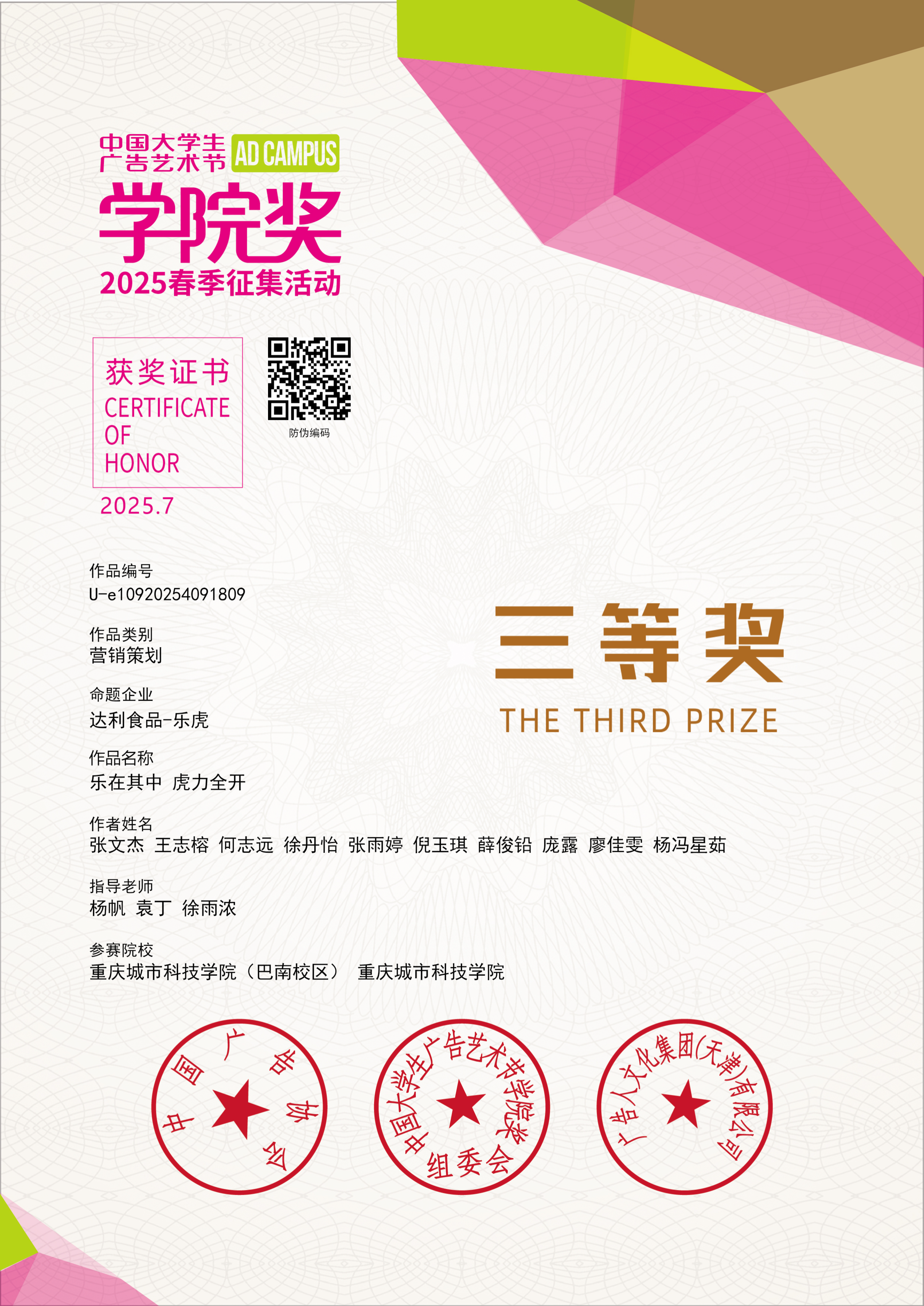 近日,全国高校关注的学院奖2025大赛(春季赛)圆满落幕。由重庆城市科技学院艺术与传媒学院学子组建的“川渝猛虎队”,凭借创意方案与扎实的实践落地能力,从全国123个大学生项目组368场活动中脱颖而出,在2025达利食品乐虎营销策划案实践大赛中成功斩获铜奖,奖金1000元。杨帆、袁丁、徐雨浓三位老师获得2025学院奖春季征集活动乐虎杰出指导教师荣誉。 艺术与传媒学院奖作为中国广告教育领域极具影响力的专业赛事,始终以“创意赋能实践”为核心,吸引了众多高校广告、设计、传媒等专业学子参与。重庆城市科技学院川渝猛虎队参加了由达利食品集团与国家级赛事学院奖联合发起的“2025达利食品乐虎营销策划实践大赛”,该大赛旨在通过自己策划、自己落地的方式,提升大学生市场营销、品牌策划、资源整合及团队协作等能力,让策划不再纸上谈兵。重庆城市科技学院学生团队在大赛过程中,积极参与项目策划与执行,展现了良好的专业知识应用能力、创新思维以及出色的沟通协调能力,达利食品集团对重庆城市科技学院川渝猛虎队在大赛中的优异表现给予认可,并为学生团队开具了实习证明。重庆城市科技学院艺术与传媒学院获中国大学生广告艺术节学院奖、创意星球网与达利食品集团联合颁发的“2025年度产教融合实践基地”奖项。 “川渝猛虎队”师生团队受邀前往北京广播大厦参加中国大学生广告艺术节学院奖2025春季征集大赛成果发布会·青春盛典。颁奖典礼现场汇聚了来自全国各高校的优秀参赛团队、广告行业资深专家及品牌代表,是一场兼具创意交流与行业视野的盛会。活动中,“川渝猛虎队”成员不仅获得荣誉证书,还受邀接受采访与其他高校学子分享了作品创作思路,充分展现了重庆城市科技学院学子积极向上、勇于创新的精神风貌。 此次获奖不仅是对重庆城市科技学院学子专业能力的肯定,更是重庆城市科技学院“以赛促学、以赛促教”人才培养模式的又一成果体现。近年来,艺术与传媒学院始终注重将课堂教学与行业实践相结合,鼓励学生参与各类高水平专业赛事,通过实战锻炼提升专业技能与创新思维,为广告、传媒行业培养了一批高素质应用型人才。未来,艺术与传媒学院将继续深化产教融合,为学生搭建更多优质的实践与展示平台,助力更多学子在专业领域持续成长、绽放光彩。(杨帆/图 文 传媒中心 谢秋雨/编辑)