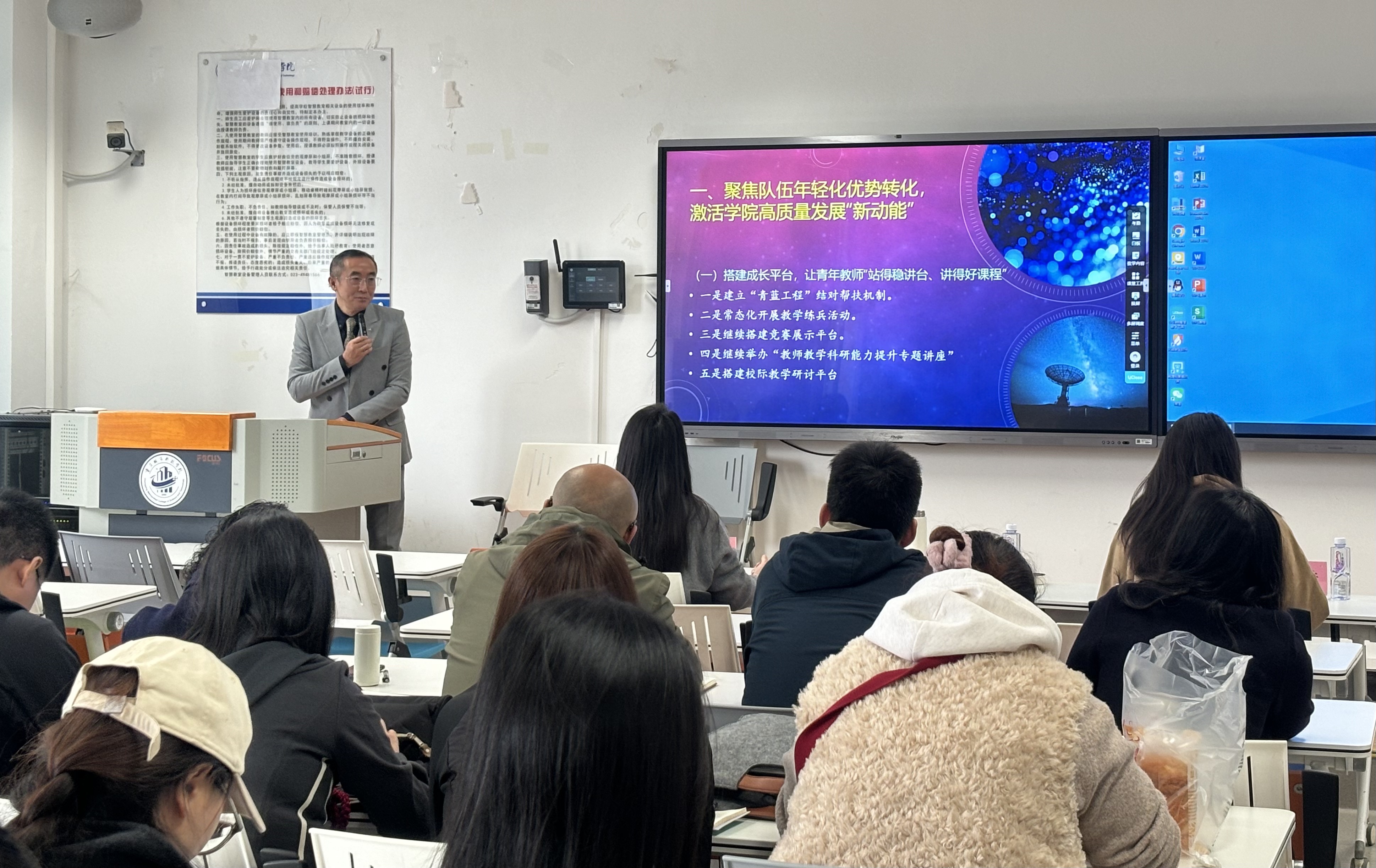 2月26日上午,马克思主义学院在主教206召开2026年新学期工作动员会。学院全体教职工参加了会议,会议由副院长张沙沙主持。 段吉福院长在简要回顾学院2025年工作基础上,对2026学院工作进行了周密部署。他指出,过去一年,学院以“筑基固本谋发展 合楫笃行启新篇”为主题,以习近平新时代中国特色社会主义思想为指导,落实立德树人根本任务,践行“政治建院、人才强院、特色立院、科研兴院”战略,在党建引领、教学质量提升、团队建设、队伍培育、专业建设、学工体系构筑等方面真抓实干,各项事业取得新进展、新成效,为新学期高质量发展奠定坚实基础。2026年学院总体工作思路是:以党建为引领,以教学为中心,以队伍为根本,以专业人才培养为使命,以科研为支撑,以学院文化为纽带,聚焦“队伍年轻化优势转化、公共事务参与度增强、团队凝聚力建设”三大核心任务,统筹推进教学、科研、育人、管理、服务各项工作,全力打造高水平思政队伍,为学校高质量发展提供坚强思想保证和人才支撑。 针对三大核心任务,段院长提出,一是要聚焦队伍年轻化优势转化,激活高质量发展“新动能”,通过搭建成长平台、强化科研赋能、完善激励机制,让青年教师站稳讲台、找准科研方向、增强职业获得感,安心从教、热心从教。二是要聚焦公共事务参与度增强,构建共建共治共享“新格局”,引导教职工树立“院兴我荣、院衰我耻”理念,拓宽参与渠道、突出实效导向,形成人人关心、建设、奉献马院的浓厚氛围。三是要聚焦团队凝聚力建设,打造同心同向同行“战斗集体”,以党建引领聚合力、文化建设润人心、制度规范促协同、关心关爱暖人心,筑牢政治根基、营造家园氛围、健全保障机制、增强情感黏性,凝聚全院发展合力。 2026年是丙午马年,寓意奔腾与进取,更契合马院人铸魂育人、勇毅前行的使命担当。段院长在讲话最后强调,全院教职工要以永不懈怠的精神状态、一往无前的奋斗姿态、求真务实的工作作风,凝心聚力、守正创新、真抓实干、砥砺奋进,奋力谱写马克思主义学院高质量发展新篇章,为学校事业发展、培养担当民族复兴大任的时代新人作出贡献。 (图/文 马克思主义学院 传媒中心 马子微/编辑)