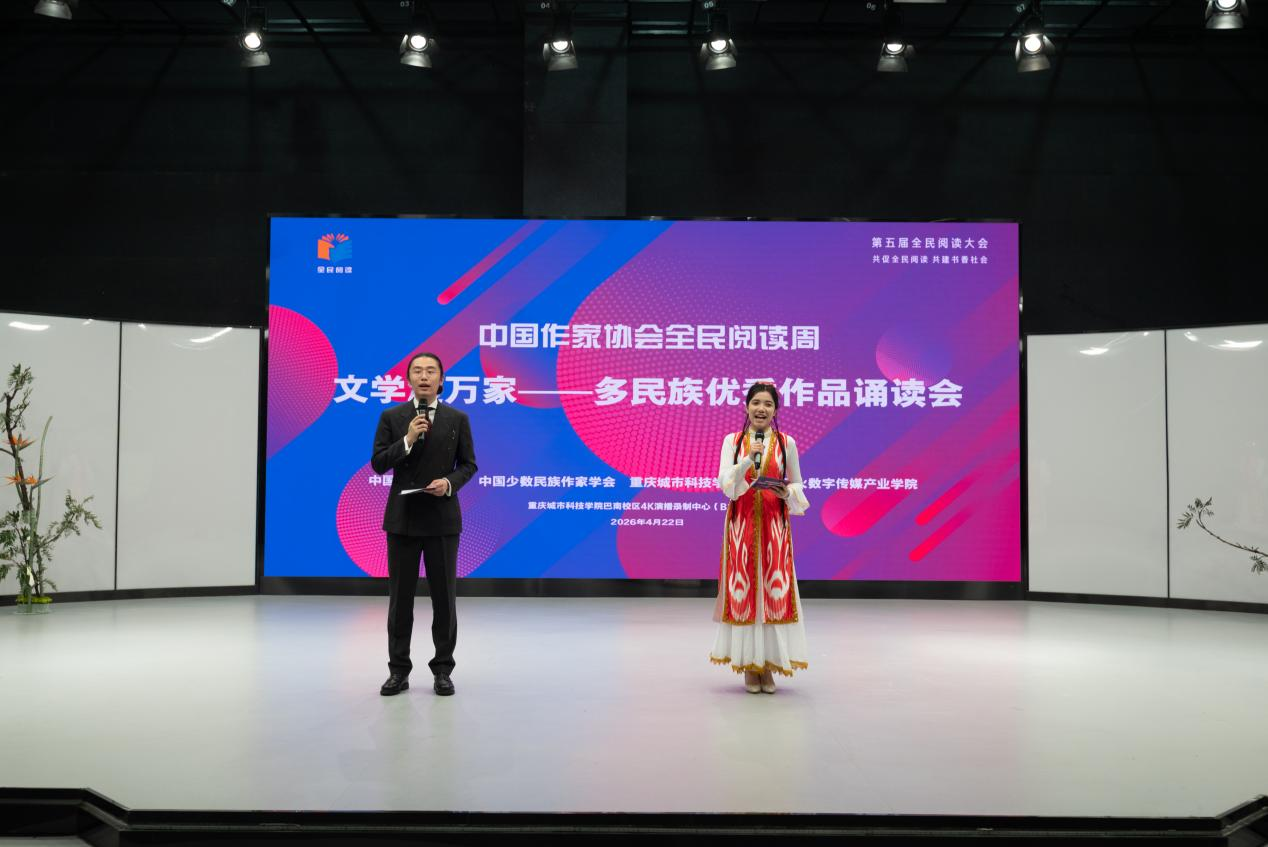 4月22日下午,重庆城市科技学院巴南校区4K演播厅内文脉流淌、声韵悠扬,中国作协全民阅读周·文学浸万家——多民族优秀诗文诵读活动正式拉开帷幕。作为学校深化全民阅读、铸牢中华民族共同体意识的重要文化实践。活动由微影星火数字传媒产业学院组织,中国作协社联部指导,中国少数民族作家学会、重庆城市科技学院联合主办,重庆城市科技学院艺术与传媒学院、巴南区融媒体中心协办。 此次活动是我区践行“渝见石榴红 同心共繁荣”民族团结工作理念的生动体现,更是推动全民阅读与民族文化传播深度融合的具体举措。活动以“铸牢中华民族共同体意识”为核心主旨,精选现当代老中青十余位优秀民族作家的诗文作品,通过沉浸式专业诵读,展现中华多民族文化多元共生、血脉相连、休戚与共的深厚底蕴,助力全民阅读在巴南落地生根,让民族同心理念深入人心。 诵读会结束后,与会专家围绕朗诵篇目及中华经典诵写讲大赛的拟报送作品,展开了系统性指导与现场示范,为学院师生提供了专业发展方面的建设性意见,进一步坚定了大家的参赛热情与信心。 活动现场,多位多民族作家诗人、评论家莅临助阵,中国少数民族作家学会会长冉冉,西藏作协原主席藏族作家吉美平阶,云南作协副主席布依族作家潘灵,重庆作协副主席苗族何炬学,江津作协副主席徐华亮、贵州作协原副主席仡佬族作家王华,白族诗人冯娜,评论家杨姿等齐聚巴南,与辖区学校师生、市民代表共同聆听这场文学盛宴,共话民族团结情、共筑文化同心圆。 步入演播厅,浓郁的民族文化气息和底蕴交相辉映。舞台主视觉以中国红、藏青为主色调,巧妙融合苗绣、壮锦、土家织锦等传统民族纹样与巴渝山水意象,主题标语庄重醒目,尽显大气典雅。4K高清大屏同步适配每一篇诵读作品,播放着对应民族的风光画卷与诗文文字,画面柔和唯美,与诵读声、定制民族背景音乐完美交融,打造出沉浸式的视听体验。现场观众满怀期待,在书香氤氲中,共同感受多民族文学的独特魅力,见证各民族文化交融共生的动人图景。 本次诵读活动分为文脉同源·民族根脉、同心聚力·文化共生、青春筑梦·家国同行三个篇章,专业诵读嘉宾、艺术与传媒学院师生分段演绎,以声传情、以文载道,将多民族文学的独特魅力展现得淋漓尽致。 开篇即经典!在第一篇章“文脉同源·民族根脉”中,老一辈民族作家们用笔墨为我们铺就了中华多民族同根同源的精神长卷,每一部作品都藏着最动人的民族情怀与人文温度。当诵读嘉宾的声音缓缓响起,满族作家老舍笔下的《济南的冬天》瞬间鲜活——温晴的冬日、秀气的山岗、清亮的河水,字字温润雅致,把对生活的热爱藏进每一段文字里,温暖又治愈;壮族作家韦其麟的《柚子树》,则以故乡的寻常草木为引,将童年的细碎记忆与深沉的乡土眷恋,化作质朴动人的诗句,字里行间都是浓郁的壮乡风情,读来满是烟火暖意;苗族作家沈从文的《箱子岩》,更是跨越十五年时光,定格下湘西龙舟竞渡的热闹盛景,也记录着乡土间的岁月变迁,笔墨间满是对民族文化的深情守望,藏着最厚重的民族根脉。三篇经典作品,跨越地域与民族,却共同诉说着各民族文化皆是中华文化瑰宝的深刻内涵,让现场观众在文字中触摸到民族根脉的温度,深化了“五个认同”思想基础。 第二篇章“同心聚力·文化共生”将活动推向高潮,中壮年多民族作家的作品聚焦当代,彰显各民族守望相助、共生共荣的时代风貌,与近年来深耕民族团结工作、促进各民族交往交流交融的实践高度契合。彝族诗人吉狄马加在《感恩大地》中,以赤诚之心礼赞大地母亲,将对自然、民族与祖国的深情感恩熔铸于诗句,真挚动人、直抵人心;藏族作家梅卓的《查旦湿地:一万颗星辰在大地闪耀》,生动描摹高原湿地的壮阔、生灵的自在与牧人的坚守,尽展雪域高原的生态之韵与民族深情;土家族作家叶梅的《大江小河》,以神农溪为线索,将土家儿女的乡愁与民俗风情揉进流水,纤夫号子似在耳畔回响。汉族作家刘亮程长期扎根新疆创作,被誉为“乡村哲学家”,其作品深植北疆乡土,以质朴诗意的笔墨,书写边疆大地的生命万象与多民族守望相助的温情。本次诵读的《大地上的家乡》节选,凭借细腻的乡土洞察与万物有灵的哲思,勾勒出边疆群众与土地相依、各民族手足情深的图景,传递出厚重的家国情怀与文化认同;苗族作家何炬学、普米族诗人鲁若迪基的作品,以乡土日常为切入点,用凝练文字承载民族生活与家国挚爱。专业教师们声情并茂的诵读,鲜活展现各民族文化交融共生的画卷,让观众深切感悟“各美其美、美美与共”的文化底蕴,更让“中华民族一家亲”的理念根植心底。 第三篇章“青春筑梦·家国同行”尽显青年一代的文化担当,明确了助力青年人才成长的工作方向。青年学子以清澈嗓音、饱满情愫,将故土眷恋、生态情怀与家国大爱融入诵读的每一个字句,彰显出新时代青年传承民族文化、铸牢中华民族共同体意识的青春风采。活动尾声,全体诵读嘉宾与师生代表齐声合诵欧震《诗意中国》,声韵磅礴、情系山河,引发全场观众共鸣,既将民族自豪与家国情怀推向高潮,也让民族团结的种子在巴南大地深深扎根、生生不息。 在铸牢中华民族共同体意识的时代命题下,此次多民族优秀诗文诵读活动,既是学校校园文化建