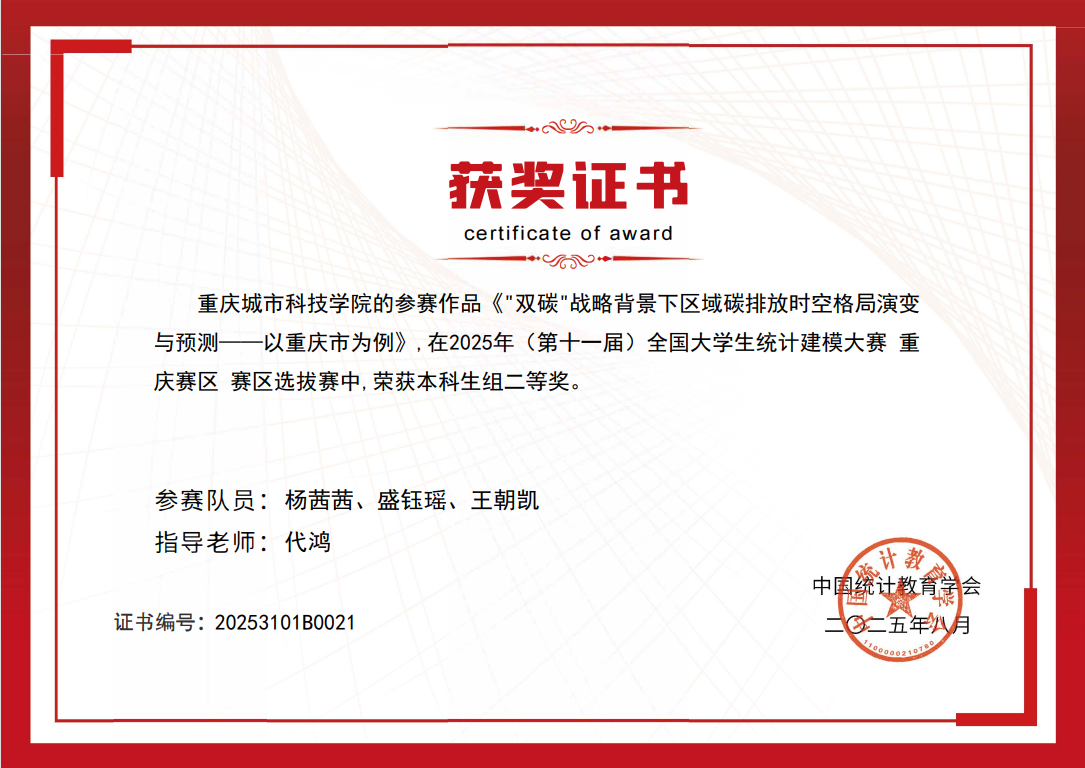 2025年(第十一届)全国大学生统计建模大赛评选结果正式揭晓,荣获本科组省级二等奖2项、三等奖5项,2025年(第十一届)全国大学生统计建模大赛重庆赛区获奖名单编号参赛人员指导老师获奖等级TJJM20250304016907杨茜茜、盛钰瑶、王朝凯代鸿二等奖TJJM20250308030153黄馨锐、肖垚、何才艺黄理二等奖TJJM20250225003909吴家敏、熊林、王原洪黄理三等奖TJJM20250223002539黄海恩、李苗苗、胡诗钰胡猛三等奖TJJM20250228009215吴程鑫、胡月、周小力代鸿三等奖TJJM20250304016872崔晓龙、黄悦、邓均益张悦三等奖TJJM20250307028148林乐、赵晨西、倪艳超陈宇三等奖(获奖名单)(奖状)全国大学生统计建模大赛是面向全国高校的重要学科竞赛。