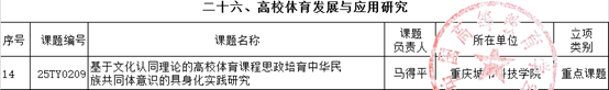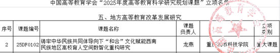 近日,中国高等学会发布了《关于公布“2025年度高等教育科学研究规划课题”立项名单的通知》(高学会〔2025〕54 号)文件,经学会严格资格审查、匿名专家评审及全社会公示等多环节严苛遴选,学校教师申报课题喜获佳绩:艺术与传媒学院龙燕老师主持的《铸牢中华民族共同体导向下“和合”文化赋能西南民族地区高校育人空间数智化重构研究》成功立项重大课题,体育与大健康学院马得平老师主持的《基于文化认同理论的高校体育课程思政培育中华民族共同体意识的具身化实践研究》获批重点课题。此次两项课题高标准立项,不仅是对学校教师科研能力与学术水平的高度认可,更实现了学校在国家级学会重大课题立项领域的历史性突破。 《铸牢中华民族共同体导向下“和合”文化赋能西南民族地区高校育人空间数智化重构研究》课题聚焦西南民族地区高校教育实践,直击多元文化整合与国家认同强化的平衡难题。研究以“和合文化”为纽带,提出“和而不同”原则协调文化冲突,运用文化符号和数字技术构建沉浸式教育环境,系统性破解民族地区高校意识形态教育碎片化问题,形成“政治认同-家国情怀-共同体意识”三阶浸润路径,推动育人目标从“课程叠加”转向“空间涵育”,助力地方院校实现从“政策执行”到“认同内生”的范式跃迁,为深化民族团结进步教育、促进文化基因传承创新、持续培养堪当民族复兴大任的社会主义建设者注入精神动能,充分彰显了中国特色社会主义教育道路的理论自信与实践创新。 《基于文化认同理论的高校体育课程思政培育中华民族共同体意识的具身化实践研究》课题以“铸牢中华民族共同体意识”国家战略为核心导向,精准聚焦高校“课程思政”改革的关键突破点,深度挖掘并彰显体育学科在立德树人与文化传承中的独特功能与价值。研究创新性运用文化认同理论,系统构建了“体育课程思政元素—具身体验与认知建构—文化情感共鸣激发—价值理念深度内化—中华民族共同体意识生成”的递进式理论模型,将体育学科的身体实践性与思政教育的文化引领性进行深度融合,不仅为高校体育课程思政建设提供了科学系统的全新理论支撑,更清晰指明了可落地、可推广的实践路径,具有重要的理论创新价值与教学实践指导意义。 学校将以此次立项为重要契机,进一步深化有组织教研的内涵建设与外延拓展,以高质量课题研究为引领,持续优化教育教学体系,不断夯实科研创新基础,稳步提升服务国家战略与区域发展的能力,在高等教育内涵式发展道路上扎实前行。(龙燕 马得平/图文 传媒中心 刘孟泽/编辑)