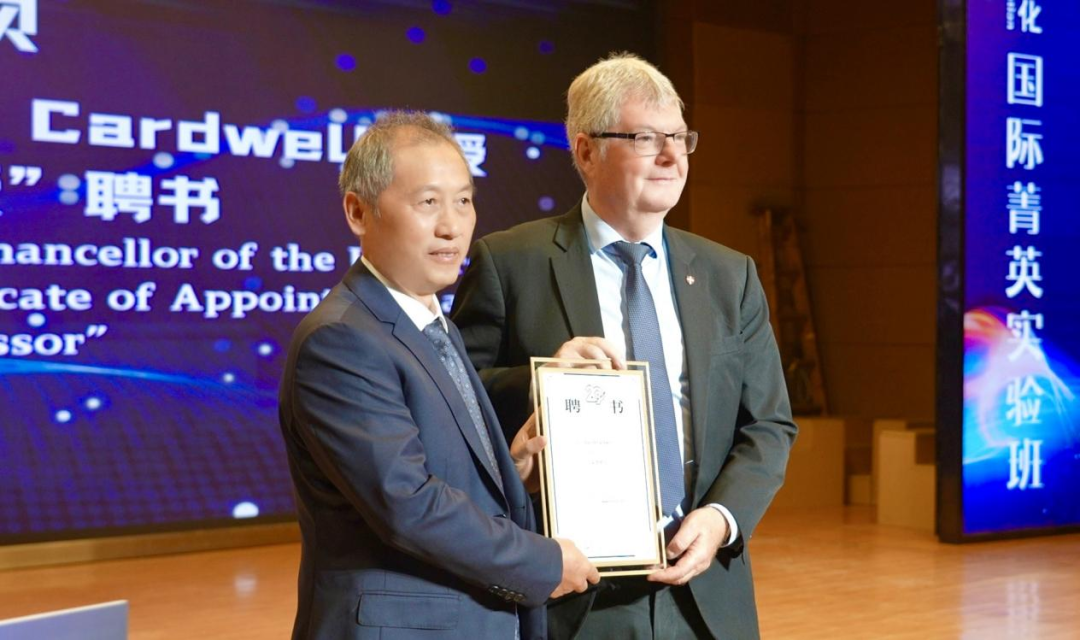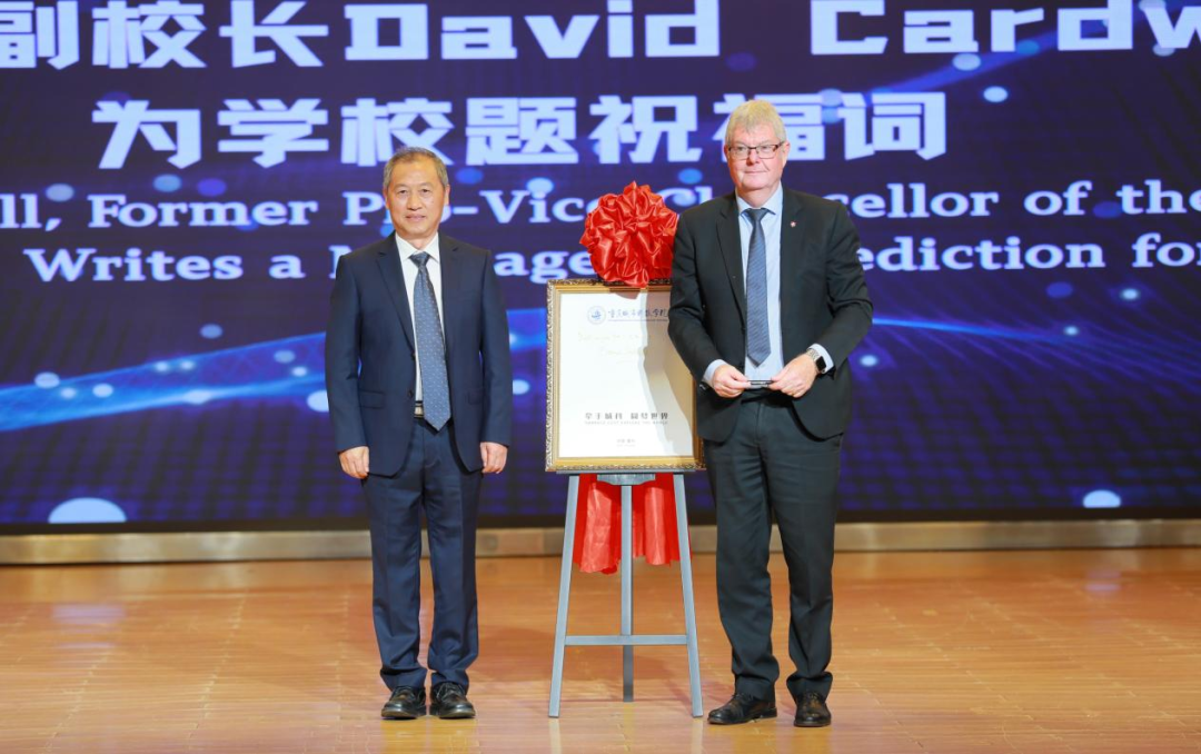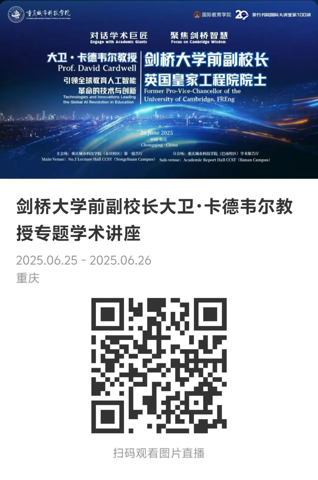 深化国际交流,共育卓越人才 6月26日,英国皇家工程院院士、剑桥大学前战略与规划副校长、工程系超导工程教授David Cardwell教授一行访问重庆城市科技学院(以下简称“城科”),开展深度学术交流。此次活动是城科践行“高端化、全球化、个性化”教育理念的重要举措,旨在拓展师生国际视野,培养具有国际竞争力的高素质人才。 沉浸城科,体验绿色校园 在交流翻译助理陪同下,Cardwell教授一行乘坐校园观光车参观了主教学楼、第一报告厅、国际菁英实验班海外硕士offer墙、智慧图书馆、三期综合实训楼、心理健康中心等地标。绿树成荫、设施完善的校园环境令教授印象深刻,他不禁赞叹:“Never seen such a beautiful green campus before!”(从未见过如此美丽的绿色校园!) 聚焦前沿,共享AI学术盛宴 主题讲座于永川校区第一报告厅隆重举行,巴南校区同步线上参与。学校理事长刘学民,校长黄宗明,党委书记、政府督导专员王银峰,副校长杜元虎、余林、贾瑞,纪委书记、校长助理田妍妮,校长助理、巴南管委会党工委书记崔继昌,Cardwell教授一行,以及师生代表出席。讲座由国际教育学院副院长万能主持。 契合“人工智能赋能教育革命”主题,本次讲座创新采用AI技术全程同声传译,有效打破语言障碍,保障了国际学术交流的高效与顺畅。 开放办学,擘画发展蓝图 理事长刘学民教授代表学校致欢迎辞。他回顾了城科二十年发展历程,介绍了“两校区、四万余在校生、五十三本科专业”的办学格局,以及与全球140余所海外高校建立的合作网络,彰显了学校“开放办学、拥抱世界”的决心。刘学民表示,人工智能正深刻重塑社会,教育亟需打破藩篱、追求共融发展。Cardwell教授带来的前沿主题恰逢其时。他感谢嘉宾莅临,期待以此为起点,携手培育未来世界公民,并预祝活动圆满成功。 解码AI,启迪教育智慧 “你好,欢迎来剑桥!”Cardwell教授以标准中文问候开场,赢得全场热烈掌声。随后,他以《引领全球教育人工智能革命的技术与创新》为题作精彩演讲。凭借其在超导工程领域的深厚造诣和丰富的国际学术交流经验,Cardwell教授以前瞻视角剖析了AI重塑教育生态的路径——从打破教育资源“中心-边缘”壁垒,到技术驱动的个性化学习变革,为城科师生描绘了教育科技发展的宏伟蓝图。50分钟的分享,充满了真知灼见与思想启迪。 讲座还通过直播连线重庆市高考志愿填报会现场,向广大考生和家长展示了城科高水平的国际化办学实力。 智慧碰撞,激荡思辨火花 互动问答环节,Cardwell教授就师生关注的“AI赋能工程应用”、“跨学科融合”、“海外升学规划”及“利用AI提升学习能力”等问题,结合剑桥案例和个人经验进行了细致解答。当电气工程与智能制造学院院长陈进教授提出关于“AI时代新能源等专业的人才培养方案设计”相关问题时,Cardwell教授深表认同,两位学者围绕应用型人才培养方案、课程设置优化及新环节设置等关键点展开了深入探讨。这场高水平的跨国学术对话,让现场师生深刻感受到理论与实践碰撞的思维魅力。 聘任荣誉,夯实合作根基 为深化合作,城科特聘教育专家James先生为“国际导师”,由副校长余林教授颁发聘书。同时,校长黄宗明教授向Cardwell教授颁发聘书,诚聘其担任学校“荣誉教授”。 题赠祝福,寄寓深厚情谊 Cardwell教授现场为城科题写祝福词,赠予黄宗明校长,为此次学术交流留下珍贵纪念。 定格瞬间,铭记交流情谊 全体与会嘉宾与师生代表合影留念,定格了城科拥抱国际前沿技术、积极探索AI赋能教育的坚定决心。 倾囊相授,启迪留学之路 Cardwell教授一行主动与计划出国深造的学生亲切交流,就语言能力提升、跨文化适应、学术规划及职业发展等话题倾囊相授,现场氛围温馨而富有启发性。 圆满落幕,共期未来华章 师生代表与来宾在学校第一食堂共进午餐,在轻松愉快的氛围中,为此次难忘的学术交流活动画上圆满句号。 剑桥大学深厚的学术积淀、前沿成果与先进理念,为城科提供了宝贵借鉴。山城的热情与剑桥的严谨在此相遇,教育创新的种子已然播下。城科将以此次高规格学术交流为契机,持续探索国际化人才培养模式,聚焦全球前沿科技,将国际智慧深度融入育人实践,致力于培养更多面向未来的时代英才,让世界看见城科,让城科走向世界!未来,重庆城市科技学院将以更开放的姿态架起中西教育文明互鉴的桥梁,为中国高等教育国际化探索注入独特的 "城科方案"。