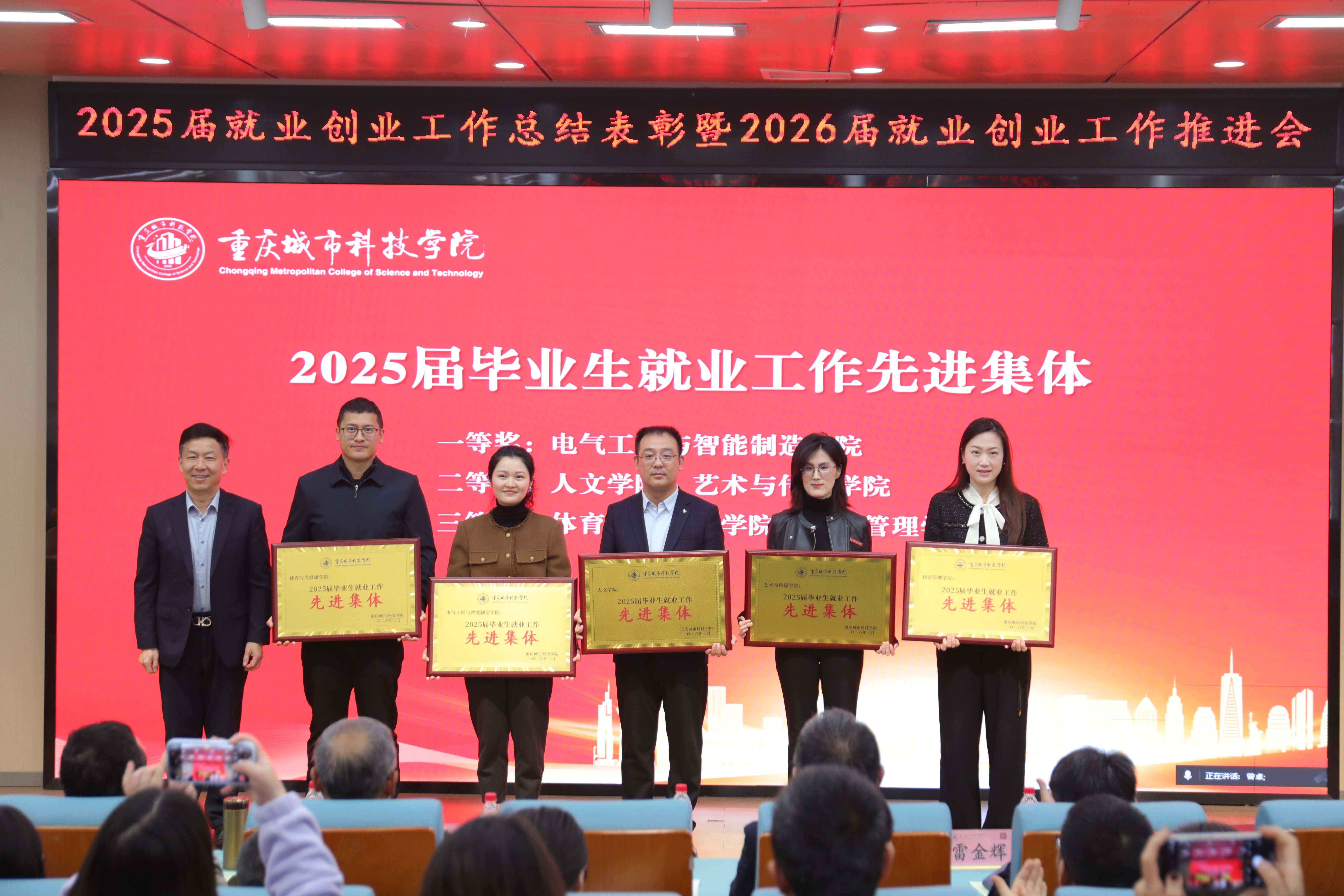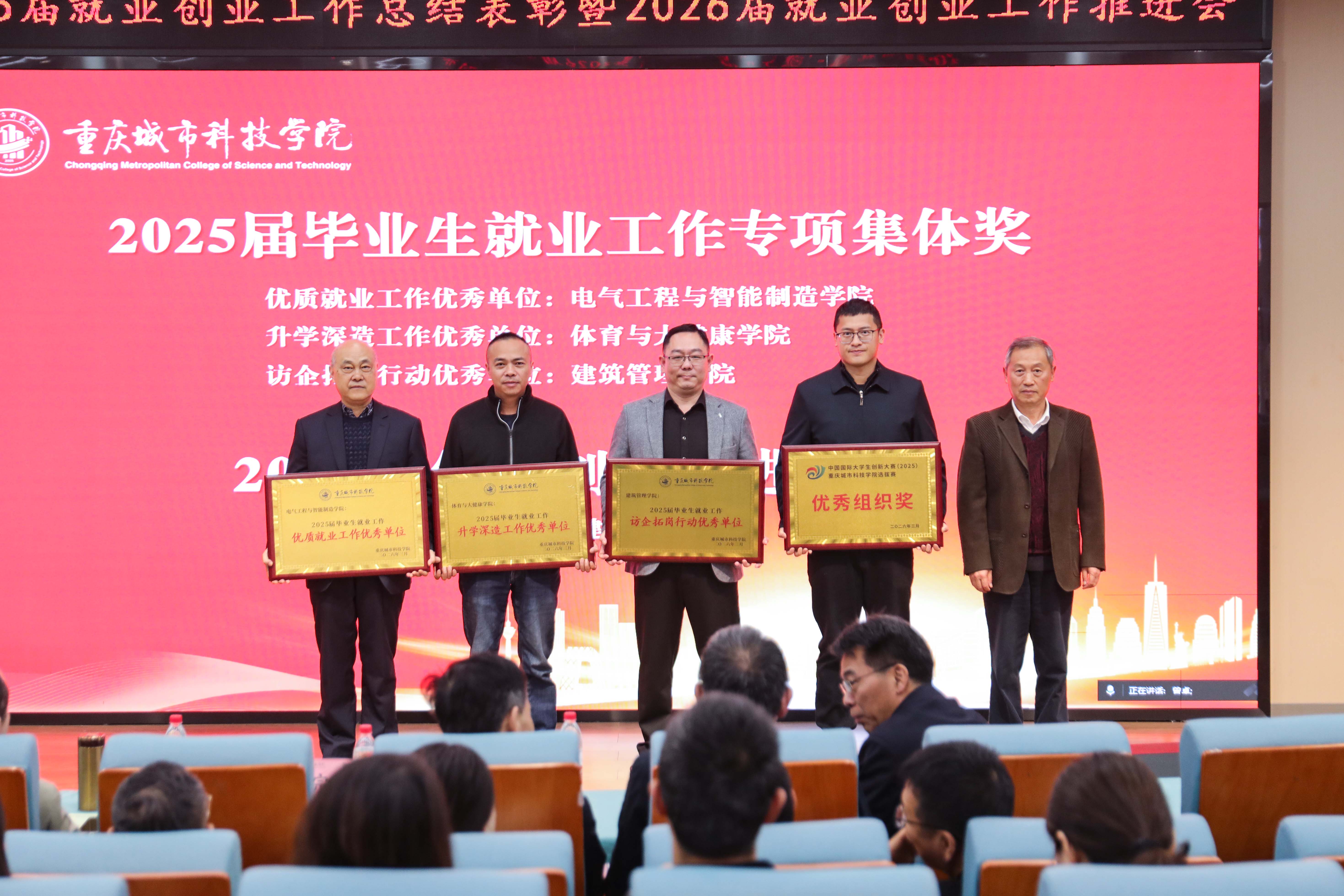 3月26日上午,学校2025届就业创业工作总结表彰暨2026届就业创业工作推进会在永川校区第二报告厅及巴南校区图书馆829会议室同步召开。本次会议旨在深入贯彻2026年全国两会精神,全面落实教育部及重庆市关于高校毕业生就业创业工作的决策部署,总结表彰学校上年度成绩,分析当前严峻复杂的就业形势,对2026届就业创业工作进行再动员、再部署、再冲刺。学校领导刘学民、黄宗明、王银峰、余林、雷金辉出席会议,学生处、教务处负责人,各二级学院党政领导、系(教研室)主任,就业中心全体人员,2026届及2027届毕业班辅导员以及相关获奖代表参加了会议。 会议首先听取了学生处处长、大学生就业指导服务中心主任马健对学校2025届就业创业工作的总结汇报,全面回顾了过去一年全校凝心聚力、攻坚克难的奋斗历程及取得的成效。 随后举行表彰仪式。校长黄宗明宣读《关于表彰2025届毕业生就业工作先进集体和先进个人的决定》及《关于表彰中国国际大学生创新大赛(2025)先进集体和优秀指导教师的决定》。在热烈的掌声中,与会校领导们分别为创新创业优秀指导教师代表、2025届就业先进及优秀个人代表、创新创业先进集体代表以及就业工作先进集体代表颁奖。这既是对获奖者的肯定,更是对全校就业工作者的激励。 人文学院党总支副书记纪振鹏、电气工程与智能制造学院教师毛盼睇、建筑管理学院辅导员向真平分别作为先进集体和优秀个人代表上台发言,分享了他们在全员联动、精准指导及创新创业赛事辅导等方面的经验做法,生动展现了学校教职工“以学生为中心”的育人初心与责任担当。 会上,党委书记、政府督导专员王银峰传达全国高校毕业生等青年就业创业工作视频会议精神,通报学校2026届就业工作进展,并对困难生帮扶、校园招聘、访企拓岗、双创赛事、育人项目等具体工作做出安排。他要求各学院抢抓春招黄金期,细化举措、迎难而上,确保圆满完成年度目标任务。 学校理事长刘学民作重要讲话。他首先代表学校向辛勤工作在就业一线的全体师生员工致以衷心感谢,并向受表彰的集体和个人表示热烈祝贺。随后,他从“国之大者”的政治高度、“人民至上”的全局视野以及“学校发展”的战略大局三个维度,阐述了做好就业工作的重要意义,深刻分析了当前毕业生就业面临的总量压力增大、结构性矛盾突出、就业预期落差及风险隐患等四大挑战。 为加快构建学校高质量就业服务体系,促进2026届毕业生高质量充分就业,他要求聚焦关键、靶向发力,坚决落实六项重点任务:一是优化培养供给体系,以市场需求为导向调整专业结构,深化校企合作,完善“招生—培养—就业”全链条联动机制;二是强化就业指导体系,引导树立务实就业观,做精个性化指导,提升求职技能,建强专业化指导队伍;三要拓宽求职招聘体系,深入开展访企拓岗行动,做优校园招聘主渠道,做好升学深造服务,拓宽多元就业路径;四是完善帮扶援助体系,对困难群体实施“一生一策”精准帮扶,确保“应就尽就”;五是落实监测评价体系,严守就业数据真实性底线,坚决杜绝虚假就业;六是巩固支持保障体系,强化使命担当,压实全员责任链条,严肃工作纪律,营造暖心向上氛围。 他强调,全校上下要切实增强“倒计时”的紧迫感和“冲刺跑”的精气神,将就业工作作为当前的头等大事来抓,以决战决胜的姿态,勇于攻坚克难,善于破解难题,全力帮助2026届毕业生实现高质量充分就业,助力学校规模与质量协同发展,为学校的高质量发展和学生的美好未来作出新的更大贡献。 本次会议进一步统一了思想,明确了方向,凝聚了共识。与会人员纷纷表示,将落实会议精神,以更加饱满的热情、更加务实的作风,全力以赴打好2026届就业创业工作攻坚战,为毕业生高质量充分就业保驾护航,向学校和社会交出一份满意的答卷。(传媒中心 易雪/编辑)